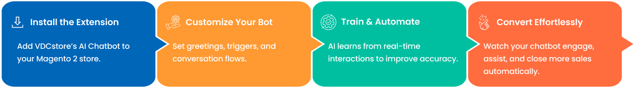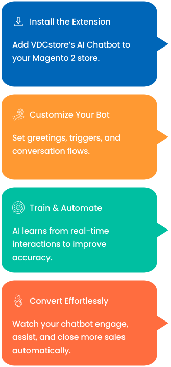VDCstore’s Magento 2 AI Chatbot transforms how your store communicates, sells, and supports customers. Powered by intelligent automation, it learns from every interaction helping you deliver personalized shopping experiences without manual effort.