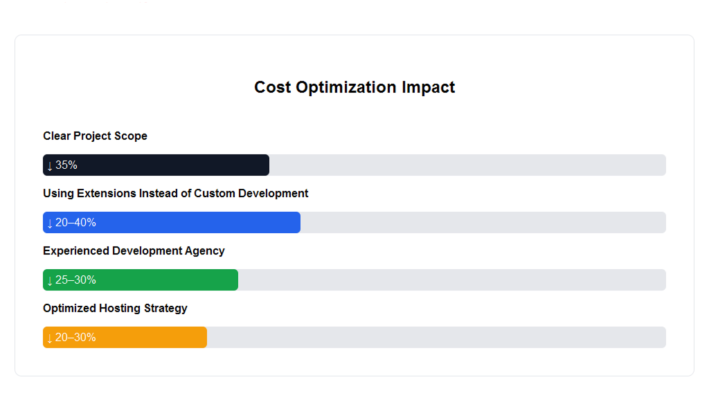 Using optimized extensions instead of building custom features can reduce development costs by 20–40%.