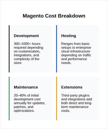 While Magento has a rich ecosystem, many functionalities rely on third-party extensions, which can add both direct costs and indirect maintenance overhead.