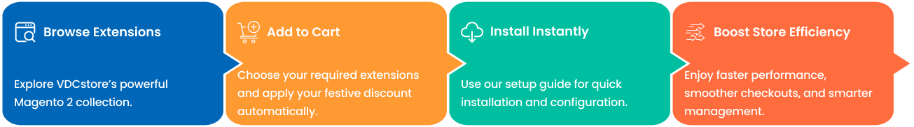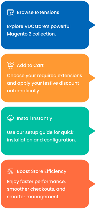 VDCstore’s Magento 2 extensions are engineered to help merchants automate tasks, enhance user experience, and drive higher conversions. Get your store ready before the festive rush begins with reliable, performance-driven solutions..