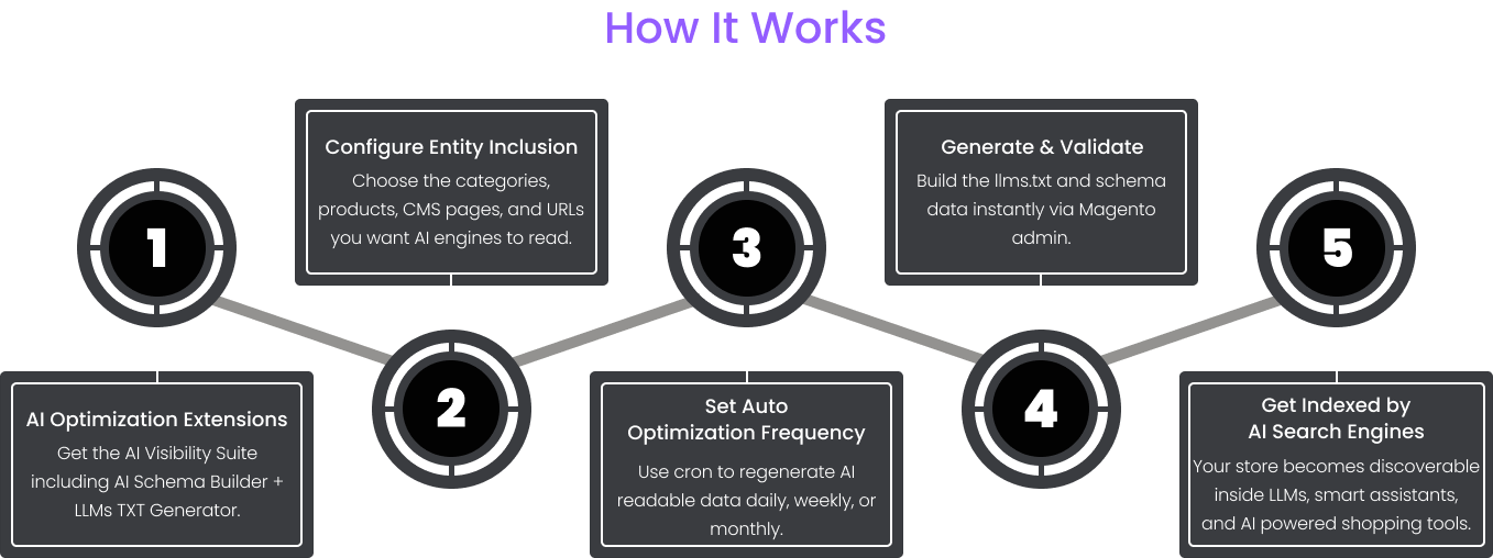 All AI optimization tools are natively integrated into Magento admin no external dashboards or SaaS platforms.