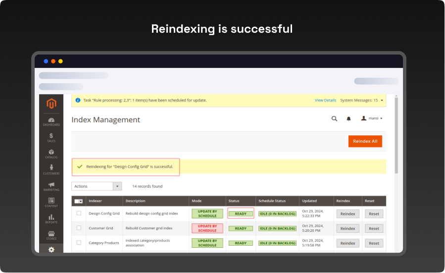 - You can check the status if reindex required you have to click on reindex button, it’ll reindexed easily.