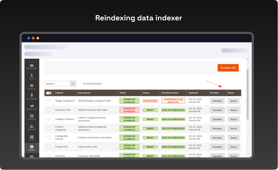 Increase your online store’s administration performance with our Reindexing for Magento 2! It is an easy-to-use extension that authorizes store administrators to re-index data from their store’s backend smoothly and fast. Magento 2 Reindex sustains store admins in actively control of the reindexing function right from the admin panel with a occasional easy clicks. Without technical technical knowledge,store admins can even begin the reindexation procedure, begin or finish reindexing.