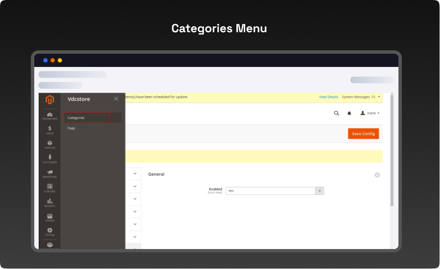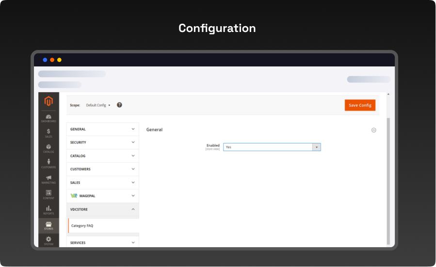 - Login to Magento Admin Stores > Configuration > VDCSTORE extensions > Category FAQ