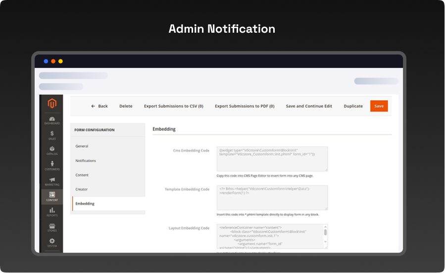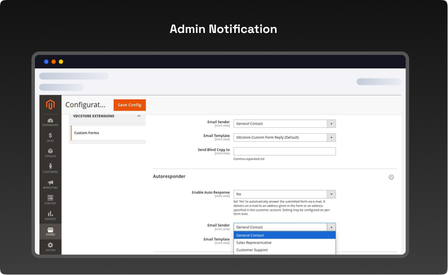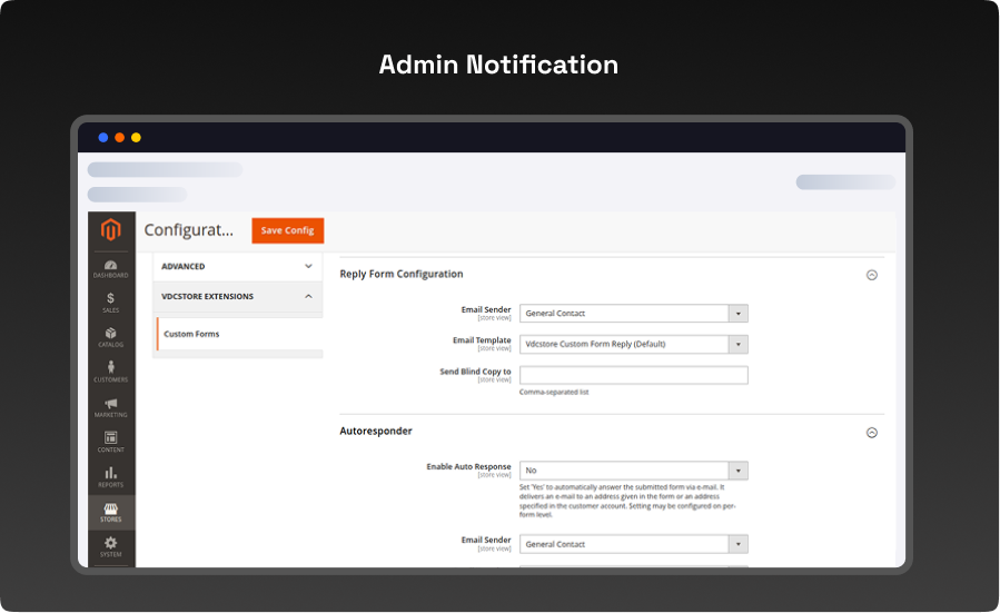 - To set up email notifications, navigate to: Stores → Configuration → VDCStore Extensions → Custom Forms.