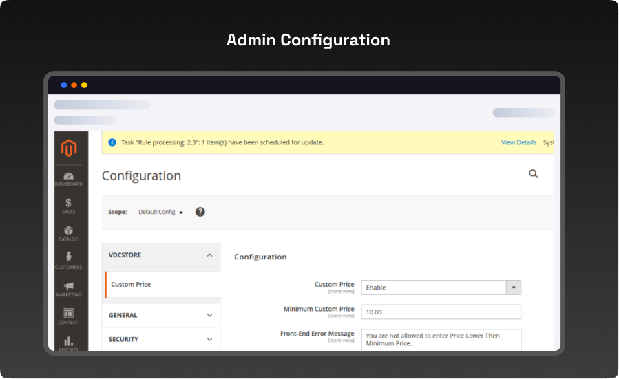 Configuration Login to the Admin Magento, Stores > Configuration > VDCStore > Custom Price