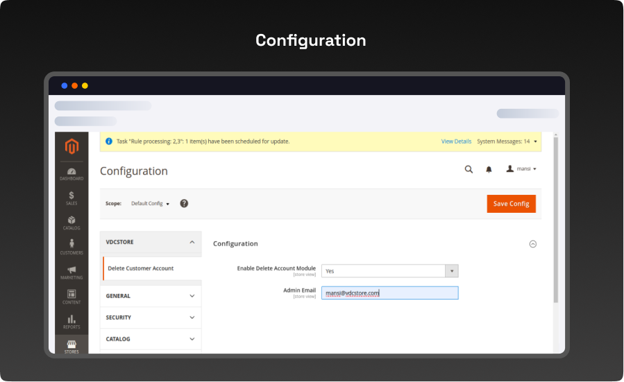 - Login to Magento Admin: Stores > Configuration > VDCSTORE Extensions > Delete Account