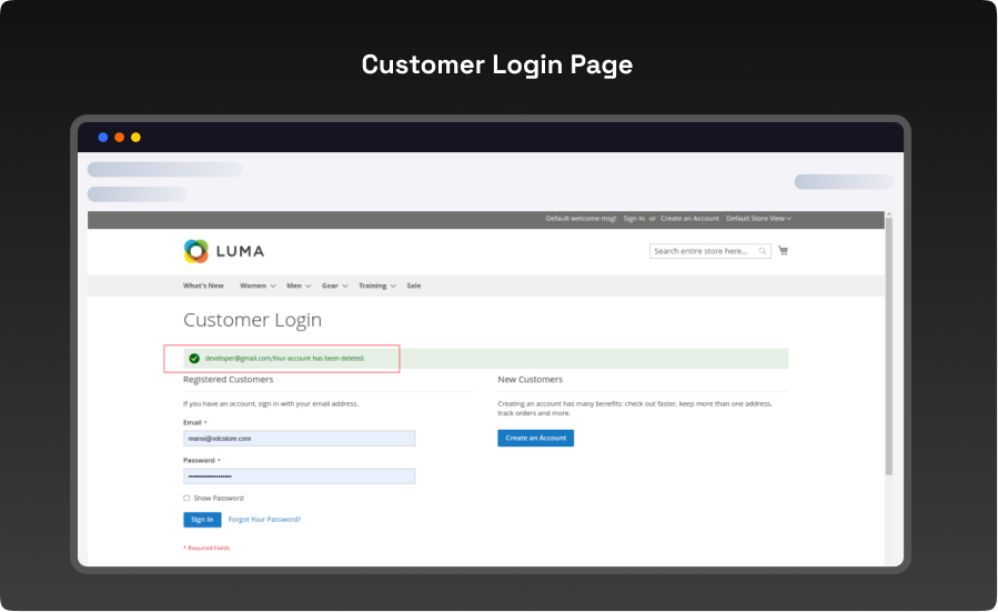 - You will be redirected on the Customer Login Page and get the message Account Deleted successfully, Create an account to login