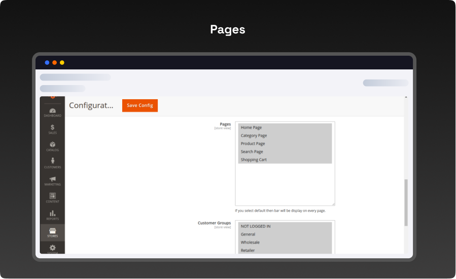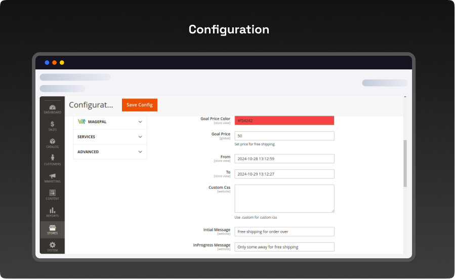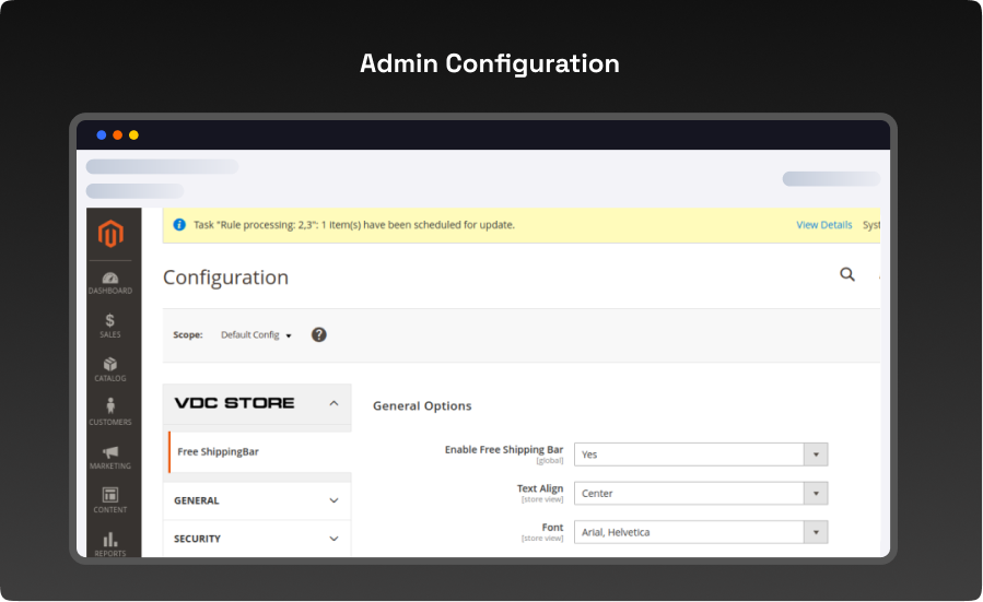 Configuration Login To The Admin Magento, Stores > Configuration > Vdc Store > Free Shipping Bar.