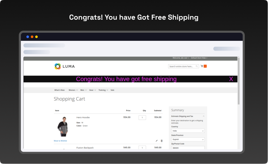 You can tempt your customers by our Magento 2 free shipping bar extension. This will upshot your customers attention on the free shipping offer you’re hosting. To get the benefits your customer will add more products to cart and end up with more shopping from your website.