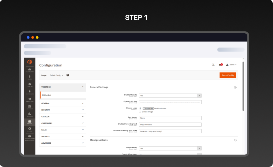 - Now let’s proceed with AI Chatbot general settings.Stores > Configuration > VDCStore > AI Chatbot