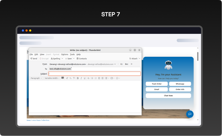 - When a customer clicks on the Email option in the chatbot, their default email client opens with the recipient email address configured in the admin settings.