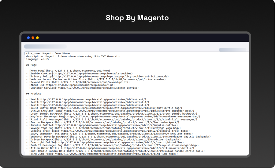 Empower your Magento 2 store with the LLMs TXT Generator to make your website AI-ready. This extension automatically generates structured and optimized llms.txt files, enabling large language models (LLMs) like ChatGPT and other AI systems to understand and represent your store content accurately. Improve your brand visibility across AI-driven platforms while maintaining full control over what data is shared. Designed for simplicity and performance, the LLMs TXT Generator helps you stay ahead in the era of AI-powered search and discovery.