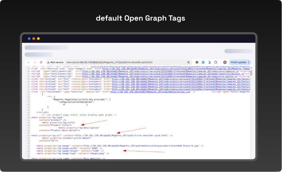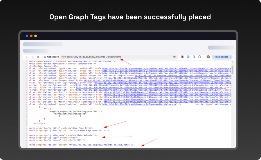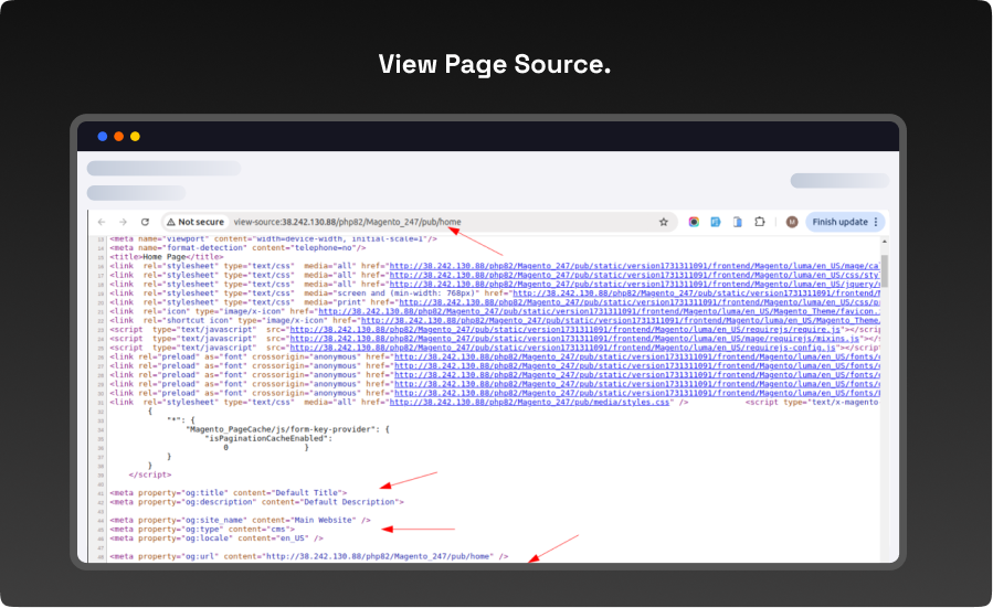 - Open any page in the storefront that isn t marked with OG tags now. Use Ctrl+U or right-click to choose View Page Source. According to your configuration settings, you can see that the default Open Graph Tags have been inserted for that page successfully in the area..