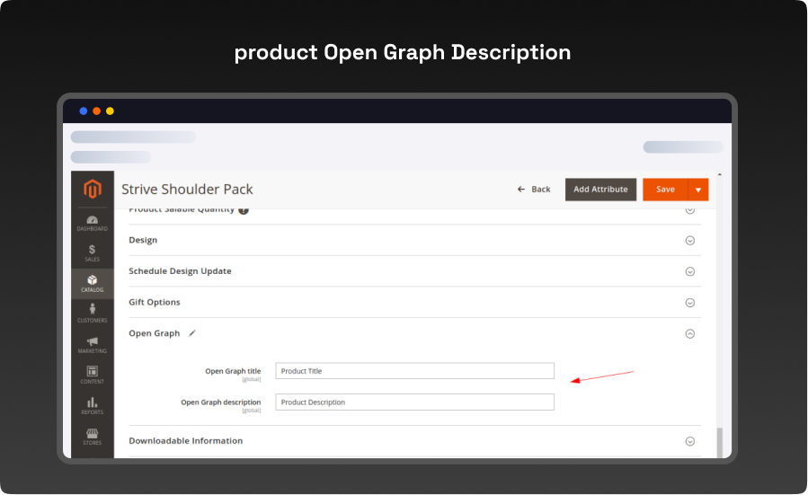 - Regarding the Product page Locate the Open Graph Metadata area after selecting a product in the Admin Panel > Catalog > Products section.