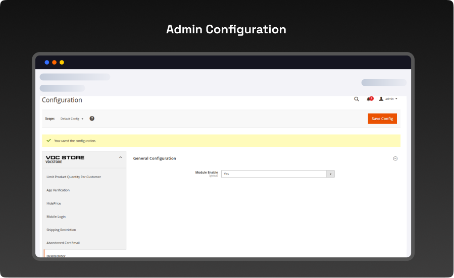 Configuration Login to the Admin Magento, Stores > Configuration > VDCSTORE> Delete Order