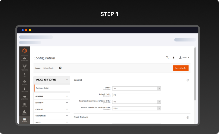 - Login to Magento Admin and redirect to Stores > Configuration > VDCSTORE extensions >Purchase order.