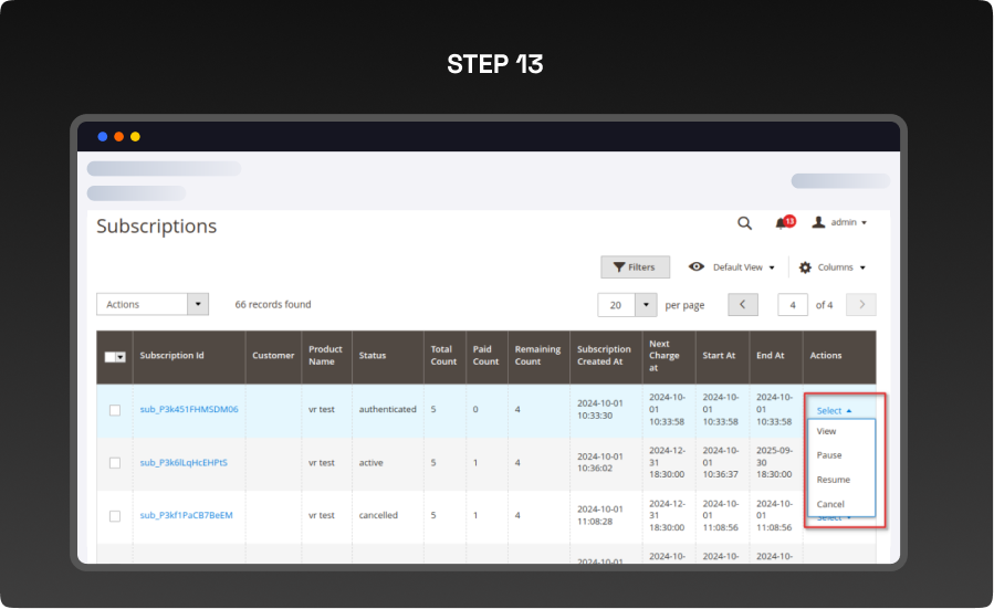 - To select a specific action, click on the particular customer. On the right side, choose an option such as Cancel, Pause, or Resume.