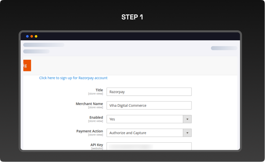 - API Key: Enter your API key which you have generated from here: https://accounts.razorpay.com/auth/?redirecturl=https%3A%2F%2Fdashboard.razorpay.com&auth_intent=login