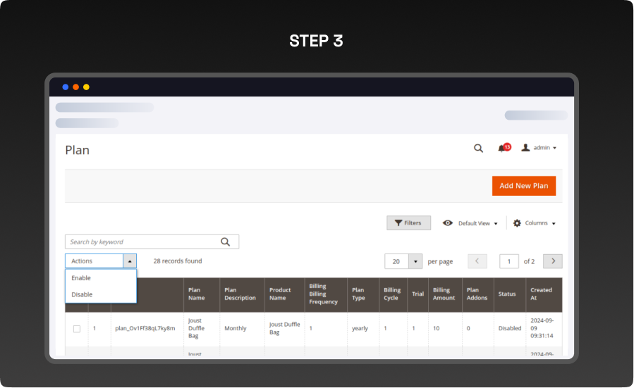 - Select actions such as ‘Enable’ and Disable’ to showcase your Razorpay plans. Also, you can add a new plan by clicking on ‘Add New Plan’.