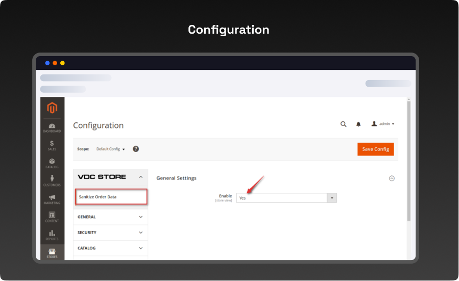 - Now let’s proceed with Sanitize Order Data general settings.Stores > Configuration > VDCStore => Sanitize Order Data