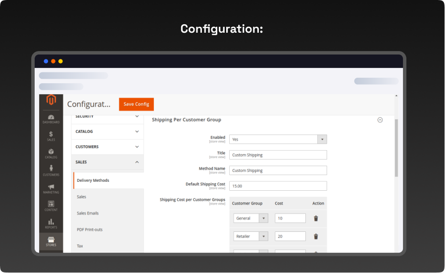 - Login to the Magento Admin Store > Configuration > Sales > delivery methods > shipping per customer Group