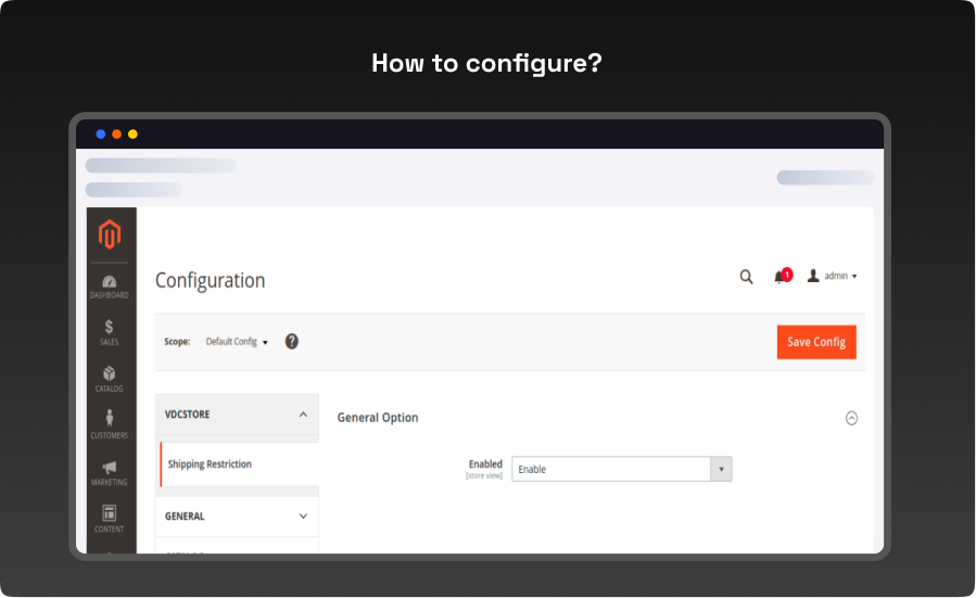 Configuration login to the Magento Admin: Stores > Configuration > VDC STORE > Shipping Restriction > General Option > Enable Extension.