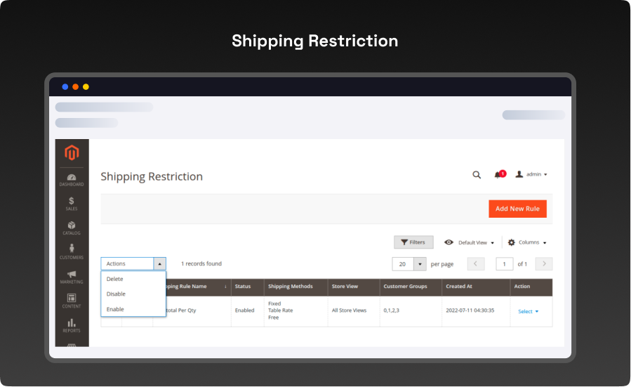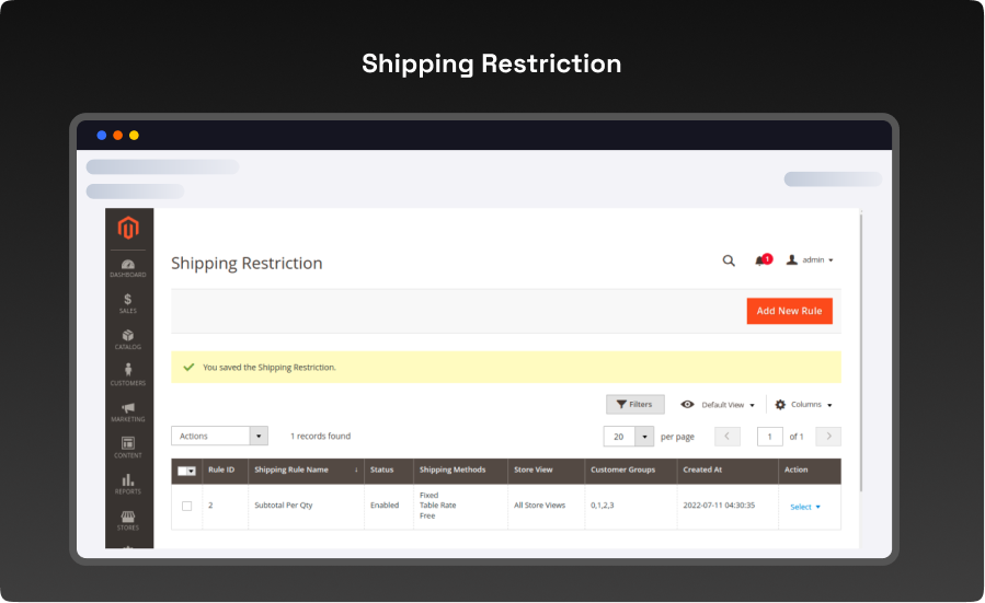 - The grid displays all the restriction rules, including rule ID, status, name, shipping carriers and methods, customer groups, and store views in one location.