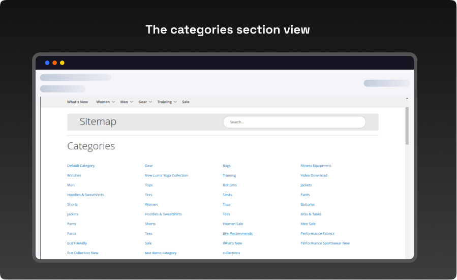 - The categories section view in the sitemap from the customer end.