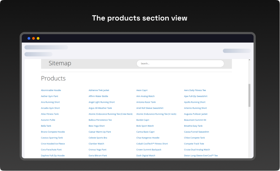 - The products section view in the sitemap from the customer end.