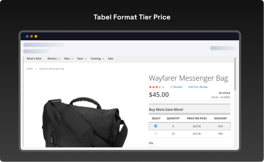 - Tabel Format Tier Price : Users can adjust the quantity directly in the quantity box by selecting the radio button in the table style of tier price display. Users can obtain a betterunderstanding of the % discount for the quantity chosen and the price per item.