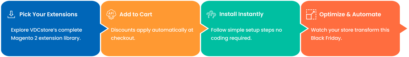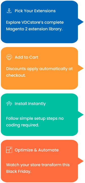 Every VDCstore extension is built to make your Magento 2 store faster, smarter, and more profitable. Whether you want to automate SEO, improve checkout flow, optimize performance, or enhance customer experience this is the moment to power up your store at a fraction of the cost.