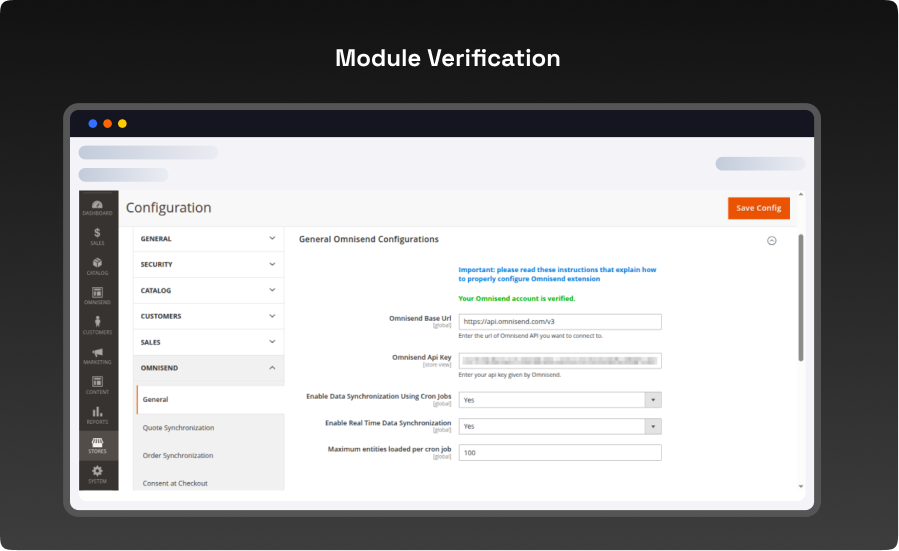- Navigate to Magento Admin → Stores → Configuration → Omnisend → General.