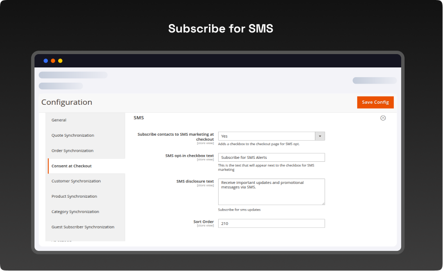 - Sort Order: set the position of the SMS checkbox at checkout.