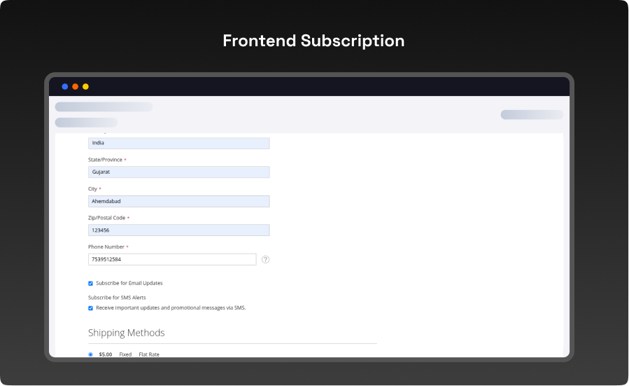 - Subscribe for Email and Subscribe for SMS — allowing customers to grant permission directly while placing their order.