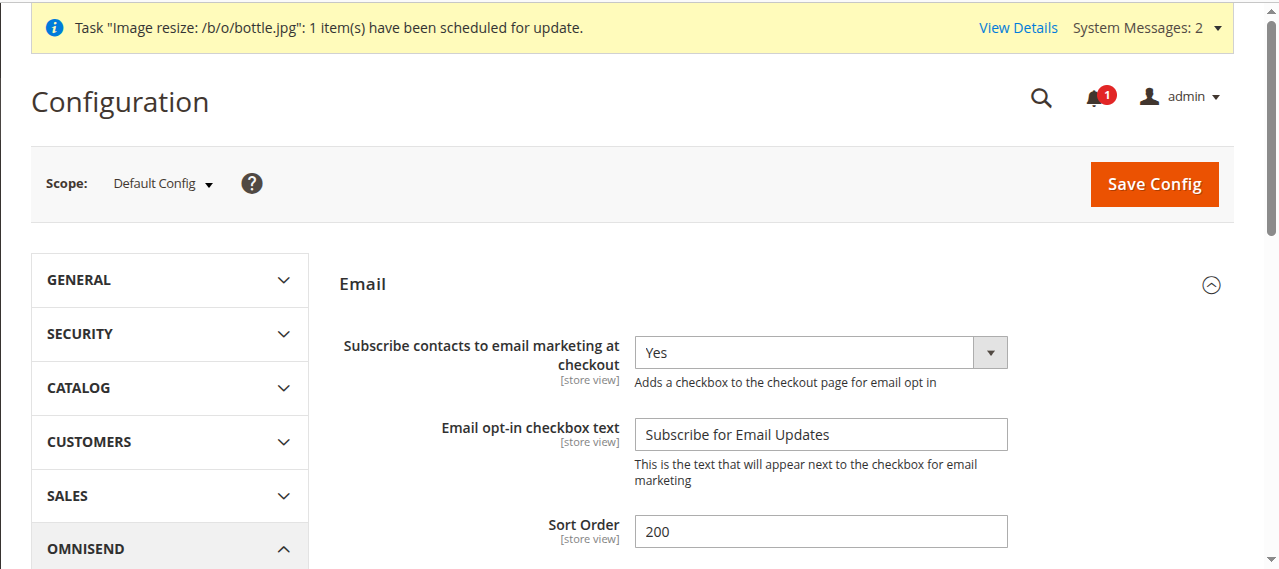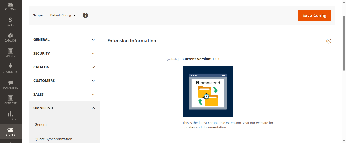 - Navigate to Magento Admin → Stores → Configuration → Omnisend → General.