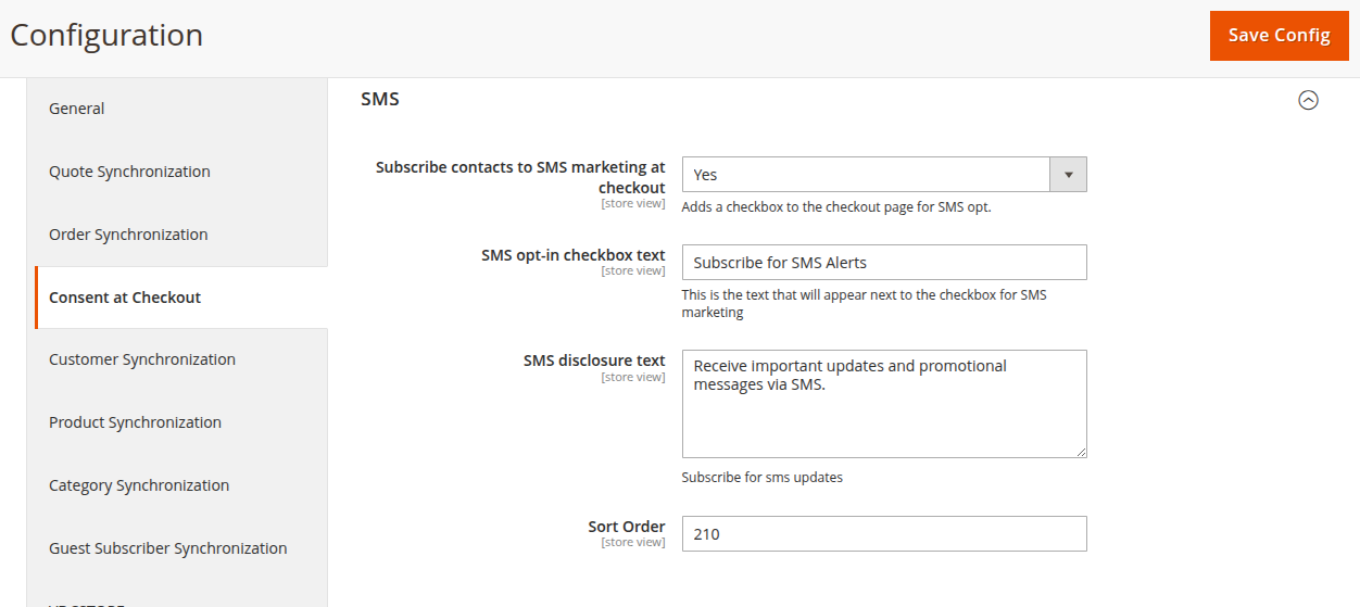 - Sort Order: set the position of the SMS checkbox at checkout.